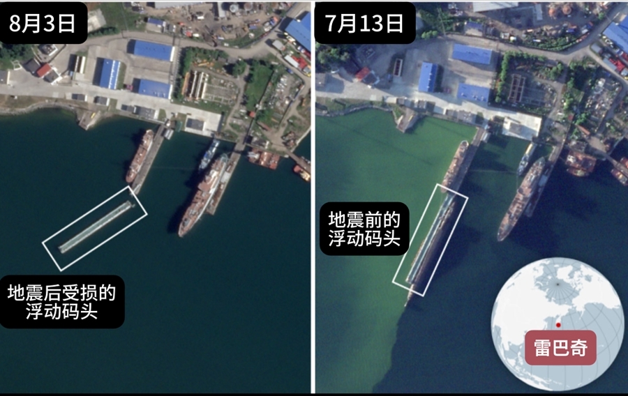 据解放日报,根据地球成像公司“行星实验室”(Planet Labs)拍摄的卫星图像,位于堪察加半岛雷巴奇核潜艇基地的一个浮动码头在大地震中受损,浮动码头的一部分似已脱离锚定,出现部分断裂。