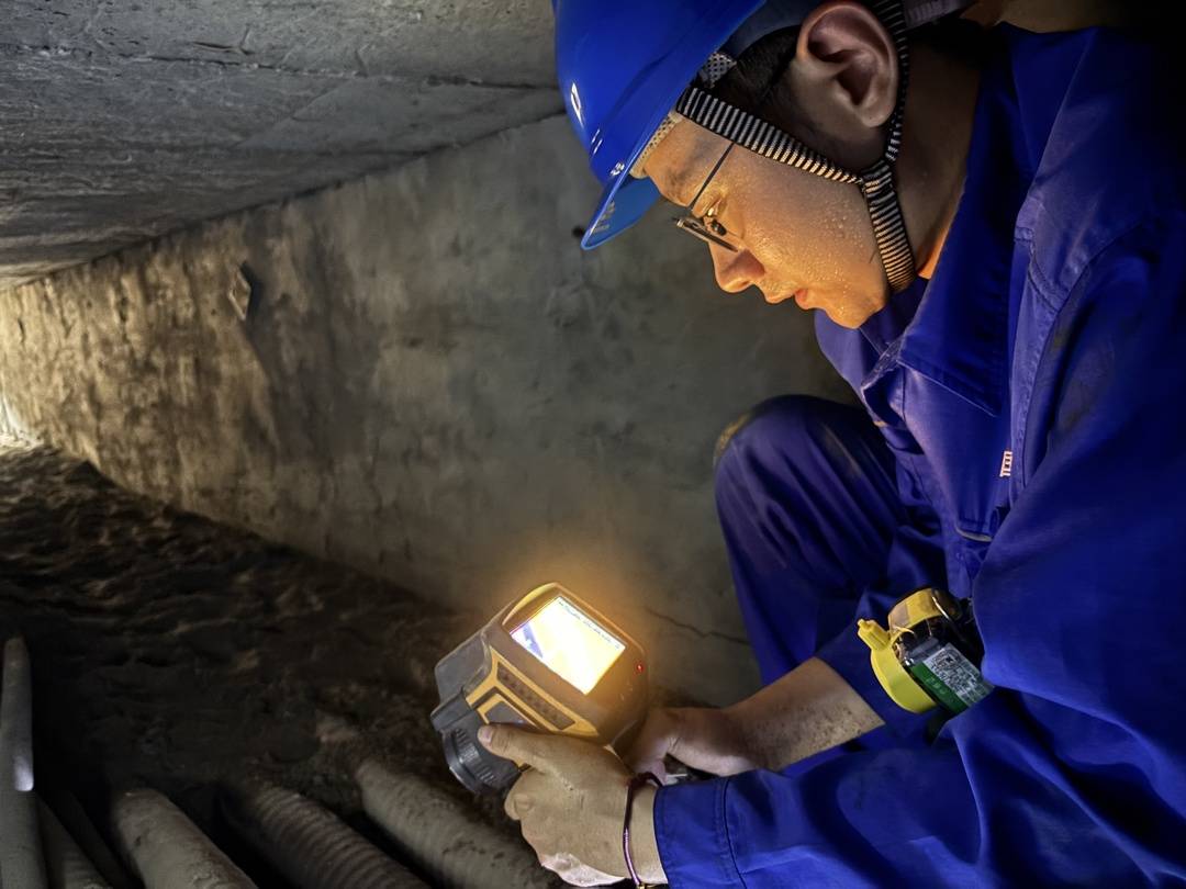 电缆运检人员对地下电缆开展特殊巡视和带电检测工作。(杨丰任 摄)