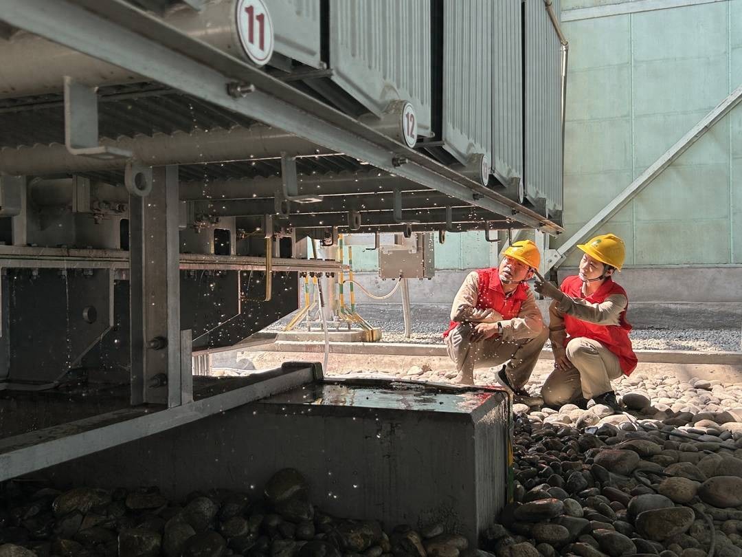 变电运维人员开展设备巡视以及主变压器辅助降温工作。(梁宇 摄)