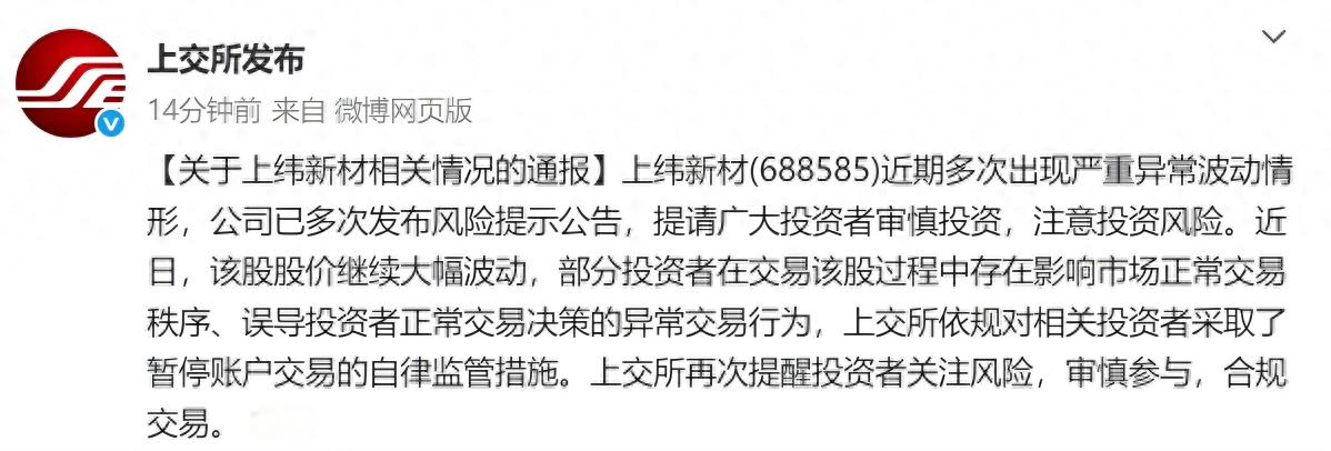 《中国经营报》记者关注到,8月5日,上交所发布情况通报,指出部分投资者在交易上纬新材股票过程中存在影响市场正常交易秩序、误导投资者正常交易决策的异常交易行为,上交所依规对相关投资者采取了暂停账户交易的自律监管措施。上交所再次提醒投资者关注风险,审慎参与,合规交易。