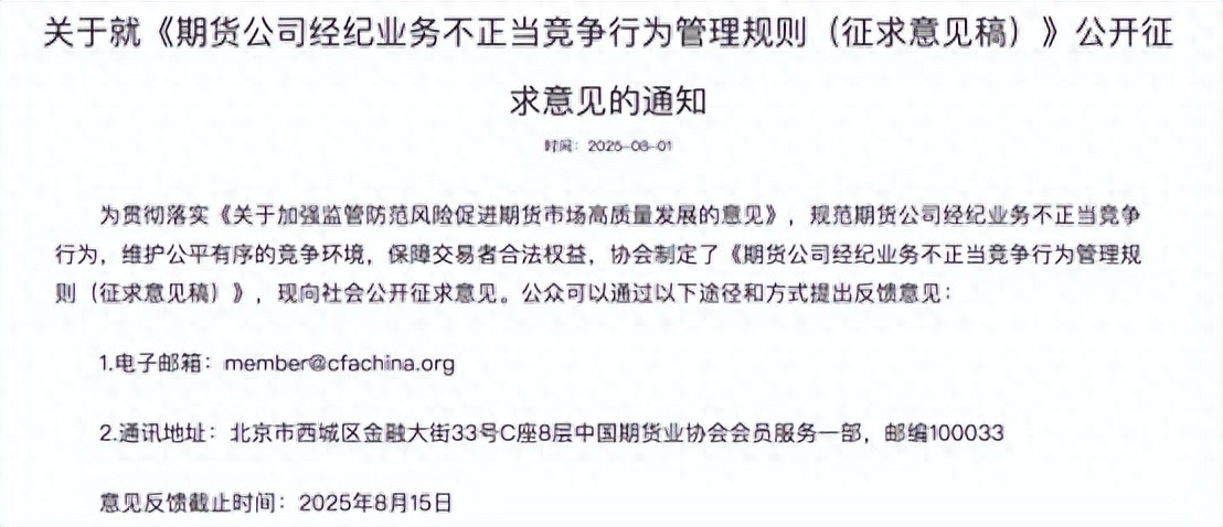 近日,中国期货业协会发布《期货公司经纪业务不正当竞争行为管理规则(征求意见稿)》(以下简称《规则》),针对期货行业长期存在的同质化竞争、手续费恶性竞争等突出问题,拟出台系列规范措施,推动行业从"价格战"向"价值创造"转型。
