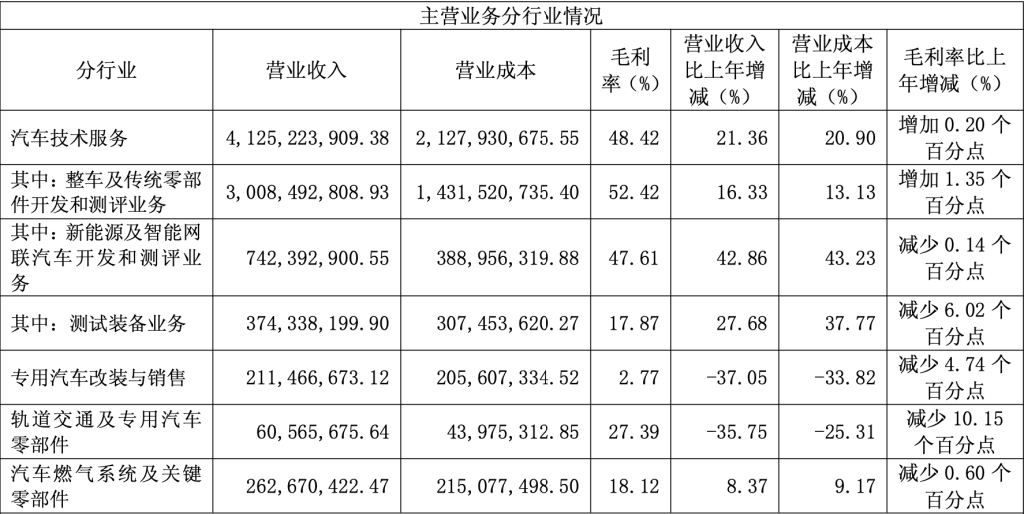 中国汽研(601965)2024年年报显示,去年公司实现营业收入46.97亿元,同比增长14.65%,实现利润总额11.4亿元,同比增长14%。 为其营收贡献最多的是测试所属的“汽车技术服务”业务板块,营收为41.25亿元,同比增长21.36%,毛利率更是高达近50%。其中,新能源及智能网联汽车开发和测评业务营收增长42.86%,但毛利率略有下滑,为47.61%。