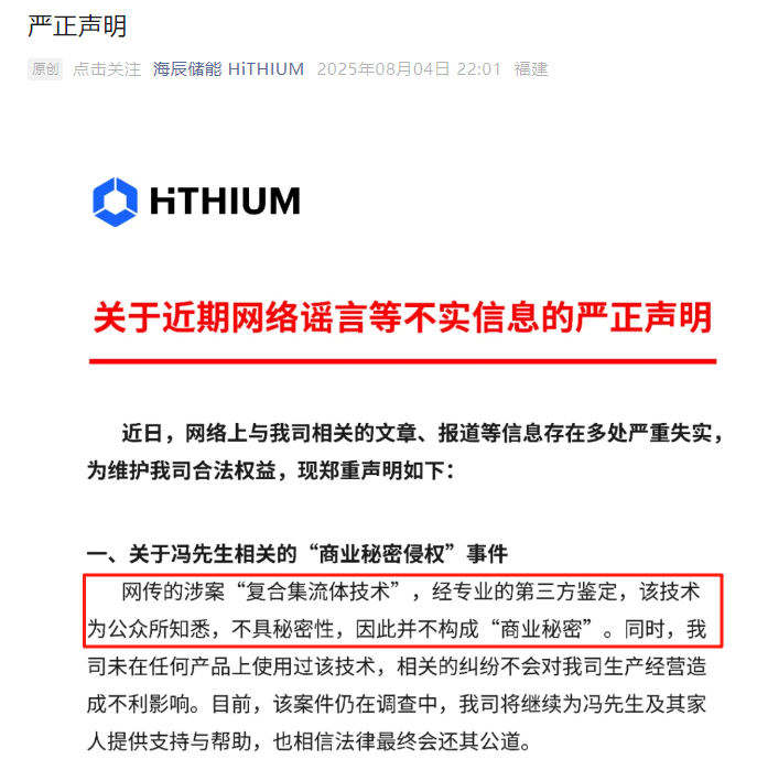 海辰储能声明称,针对与冯登科相关的“商业秘密侵权”事件,网传涉案“复合集流体技术”经专业的第三方鉴定,该技术为公众所知悉不具有秘密性,因此不构成商业秘密。