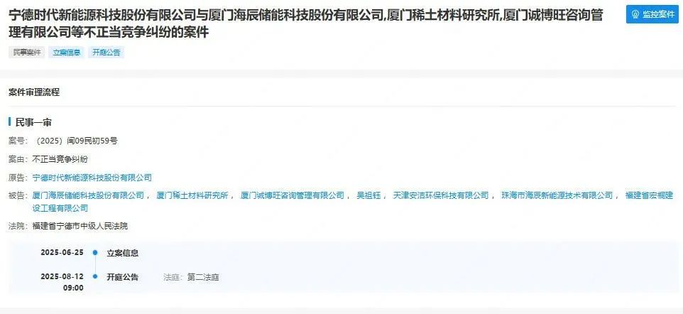 天眼查显示,近日,宁德时代以“不正当竞争纠纷”为由起诉海辰储能,福建省宁德市中级人民法院已于6月25日立案,将于8月12日开庭审理。