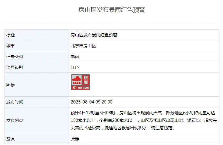 房山区发布暴雨红色预警:预计4日12时至5日08时,房山区将出现暴雨天气,部分地区6小时降雨量可达150毫米以上,个别点200毫米以上,山区及浅山区出现山洪、泥石流、滑坡等灾害的风险极高,低洼地区极易出现积水,请注意防范。
