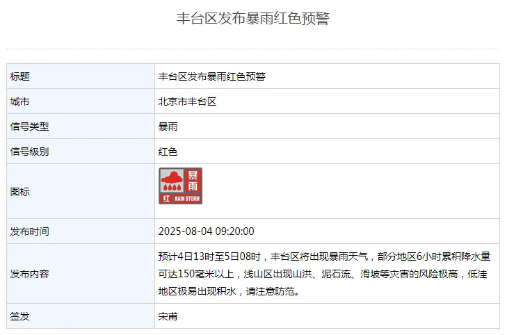 丰台区发布暴雨红色预警:预计4日13时至5日08时,丰台区将出现暴雨天气,部分地区6小时累积降水量可达150毫米以上,浅山区出现山洪、泥石流、滑坡等灾害的风险极高,低洼地区极易出现积水,请注意防范。
