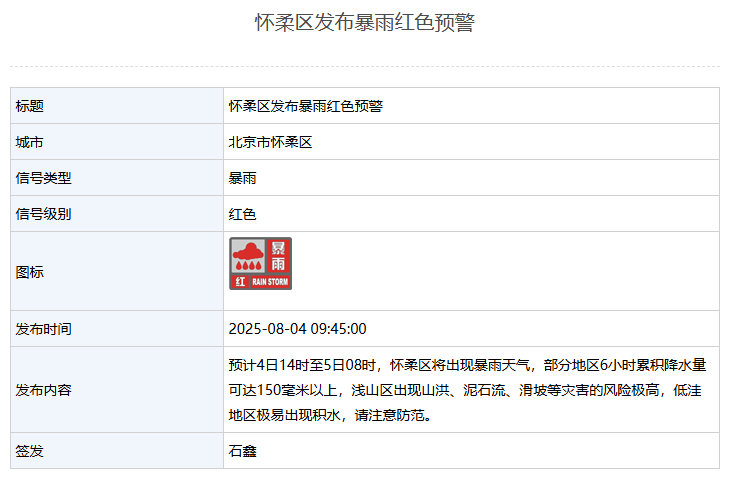 怀柔区发布暴雨红色预警:预计4日14时至5日08时,怀柔区将出现暴雨天气,部分地区6小时累积降水量可达150毫米以上,浅山区出现山洪、泥石流、滑坡等灾害的风险极高,低洼地区极易出现积水,请注意防范。