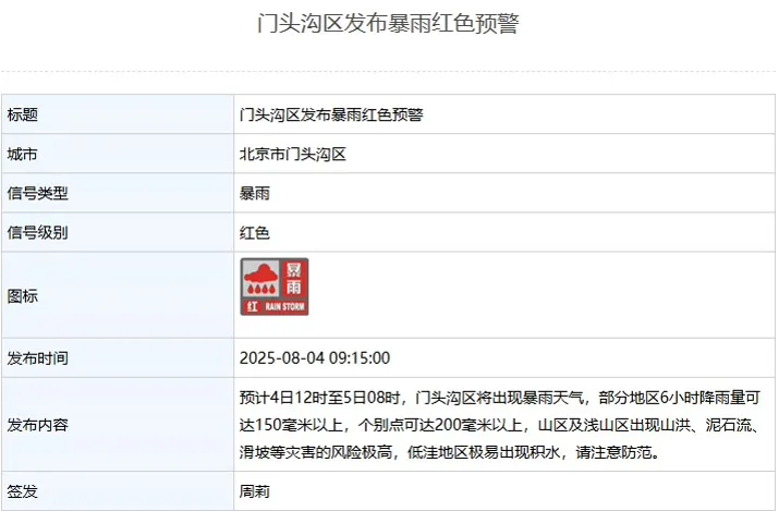 8月4日上午,北京门头沟区、房山区、丰台区、石景山区、怀柔区气象台升级发布暴雨红色预警信号。