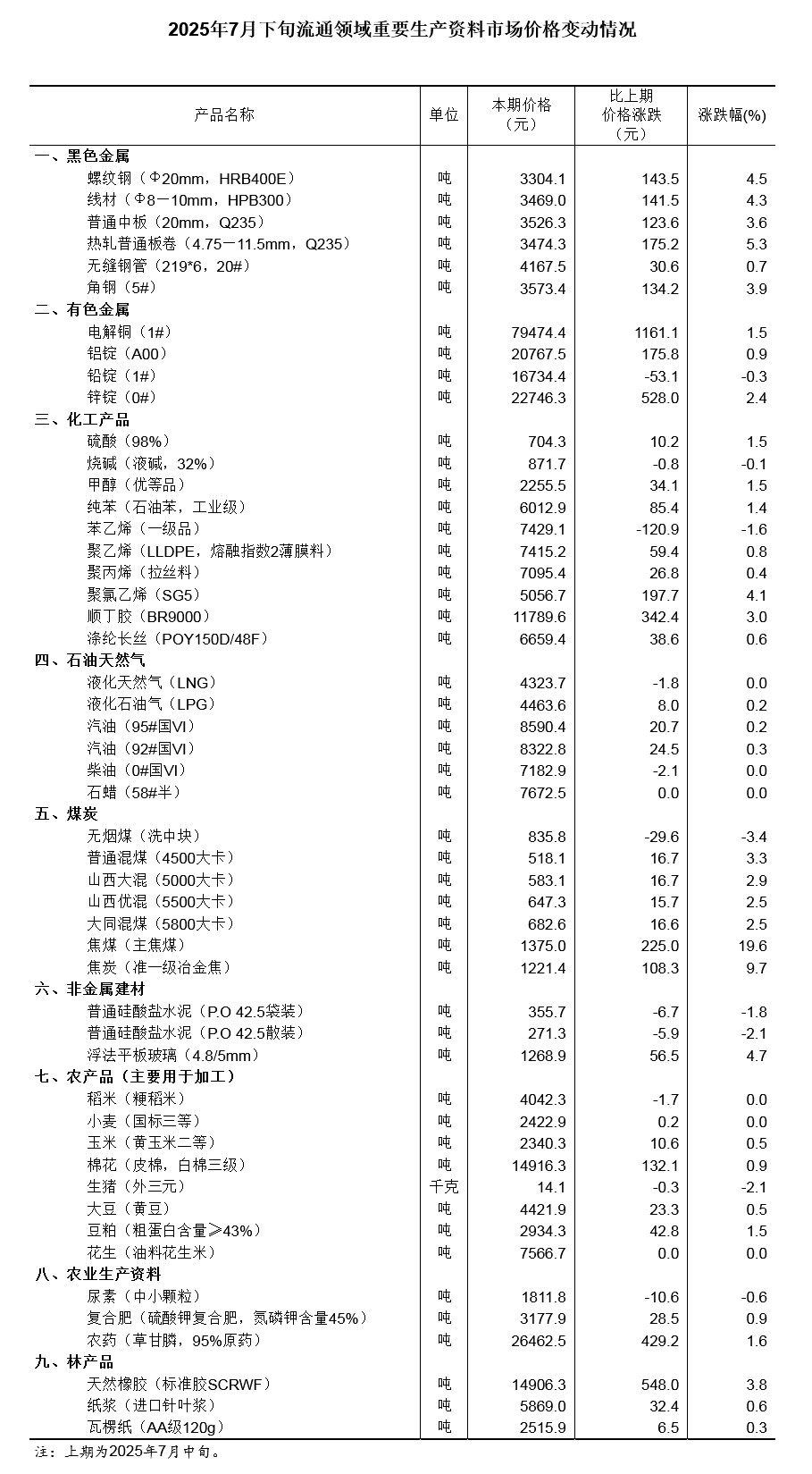 据国家统计局网站消息,据对全国流通领域9大类50种重要生产资料市场价格的监测显示,2025年7月下旬与7月中旬相比,36种产品价格上涨,8种下降,6种持平。