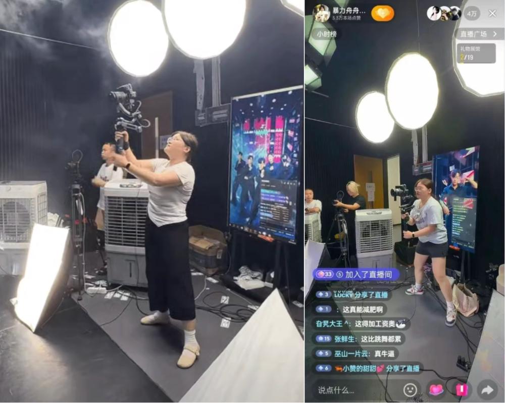 “以前拍婚庆,那叫‘定点记录’。” 舟舟回忆,“一天200块,机器往三脚架上一杵,镜头跟着新人走就行。” 而团播运镜,完全是另一个维度的挑战: “节奏快得像打仗,你得扛着几公斤的稳定器跟着跑、蹲、转,一场一小时下来,衣服能拧出水。”最长的时候,她一天运镜直播6小时。舟舟从婚庆兼职起步,转型为专业运镜师,拿到令同学们羡慕的薪资。
