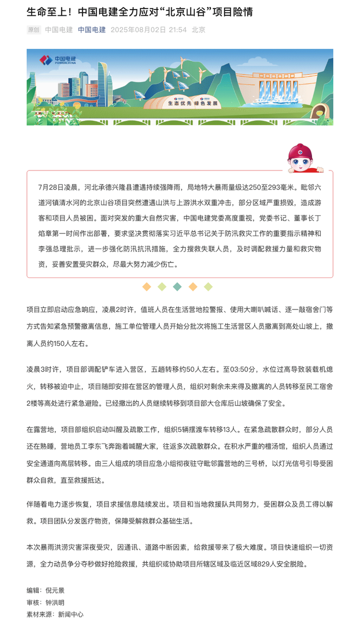 8月2日,中国电建官微发文表示,7月28日凌晨,河北承德兴隆县遭遇持续强降雨,局地特大暴雨量级达250至293毫米。毗邻六道河镇清水河的北京山谷项目突然遭遇山洪与上游洪水双重冲击,部分区域严重损毁,造成游客和项目人员被困。面对突发的重大自然灾害,中国电建党委高度重视,党委书记、董事长丁焰章第一时间作出部署,要求进一步强化防汛抗汛措施,全力搜救失联人员,及时调配救援力量和救灾物资,妥善安置受灾群众,尽最大努力减少伤亡。据中国电建介绍,本次暴雨洪涝灾害深夜受灾,因通讯、道路中断因素,给救援带来了极大难度。项目快速组织一切资源,全力动员争分夺秒做好抢险救援,共组织或协助项目所辖区域及临近区域829人安全脱险。