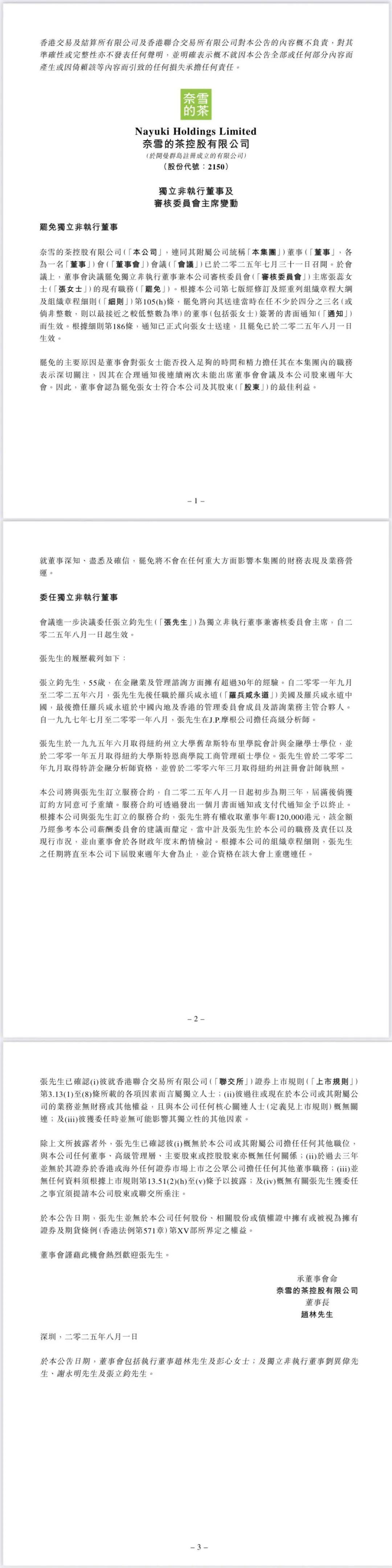 知名新茶饮品牌奈雪的茶8月1日发布公告称,董事会已通过决议,罢免张蕊女士的独立非执行董事兼审核委员会主席职务,该罢免已于2025年8月1日正式生效。