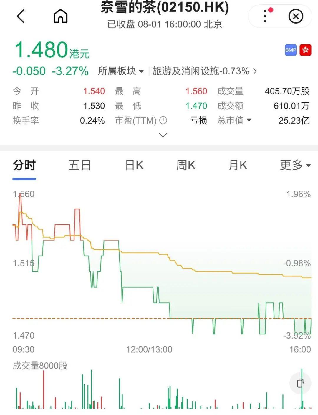 截至2025年8月1日,奈雪的茶股价仅为1.48港元,市值为25.23亿港元,其股价较发行价已累计下跌超90%,市值大幅缩水。