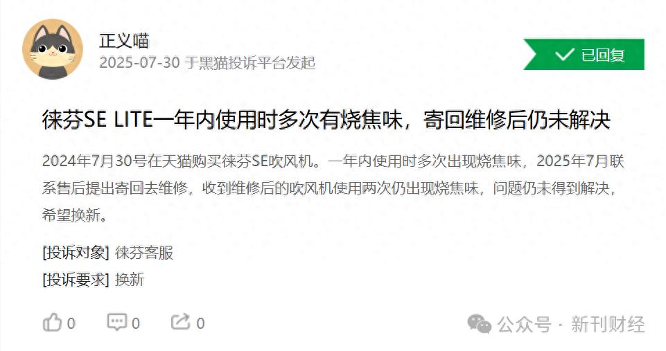 2025年7月30日,一位消费者在黑猫投诉平台宣称,其在2024年7月30号在天猫购买的徕芬SE吹风机,一年内使用时多次出现烧焦味,2025年7月联系售后提出寄回去维修,收到维修后的吹风机使用两次仍出现烧焦味,问题未得到解决。8月1日这位消费者在黑猫平台补充道,商家说将会尽快安排专人处理,但至今无任何人联系。