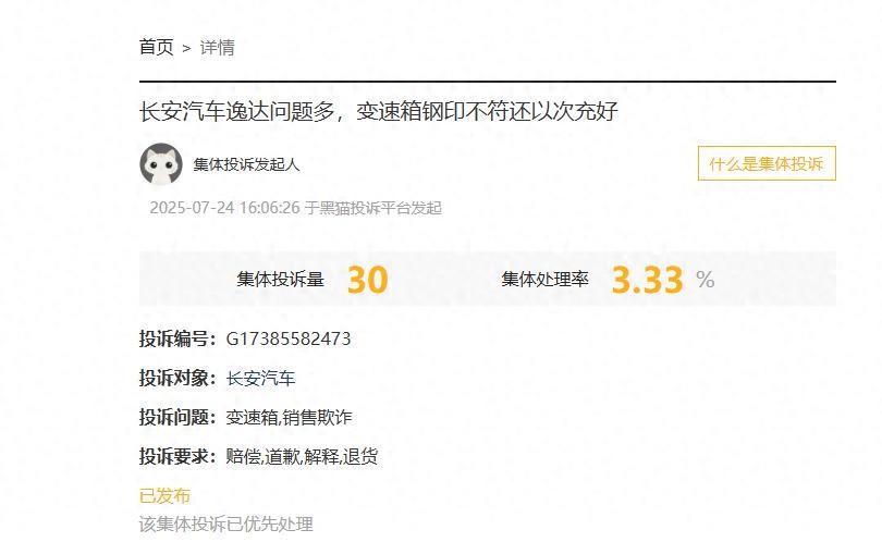 7月24日,黑猫投诉平台上出现一则集体投诉称,长安逸达部分车型的同一变速箱(器)上出现两个钢印,分别为733型与727型(旧款)。据相关投诉者表示,由于727型存在已知缺陷,且在当初购买时卖家并未告知,因此认为损害其消费权益。截至目前,在黑猫投诉平台上,涉及“长安汽车逸达”的相关投诉为348条,所涉集体投诉处理率仅为3.33%。
