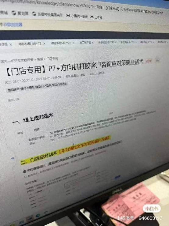车主们认为,小鹏汽车没有把主要精力用在解决车辆的安全隐患上,而是用在了如何对付维权车主上。一位车主在一家小鹏汽车售后人员的电脑上拍到了令人震惊的内容:“P7+方向机打胶客户咨询应对及策略话术”。这些话术大多是表示理解和同情,但不承认问题,也不解决问题。