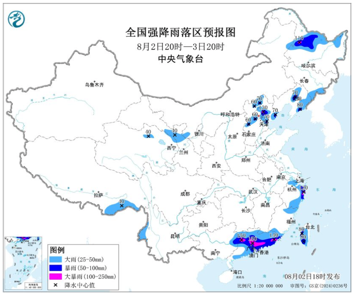 预计,8月2日20时至3日20时,河北中北部、北京西南部和东北部、天津、黑龙江中北部、吉林中东部、辽宁、浙江东部、台湾岛西部、福建东南部、广东、广西东部、甘肃中部、青海东北部等地的部分地区有大到暴雨,其中,河北北部、北京东北部、天津北部、黑龙江西部、广东中部和东南部等地的局部地区有大暴雨(100~150毫米)。上述部分地区伴有短时强降水(最大小时降雨量20~50毫米,局地可超过80毫米),局地有雷暴大风等强对流天气。