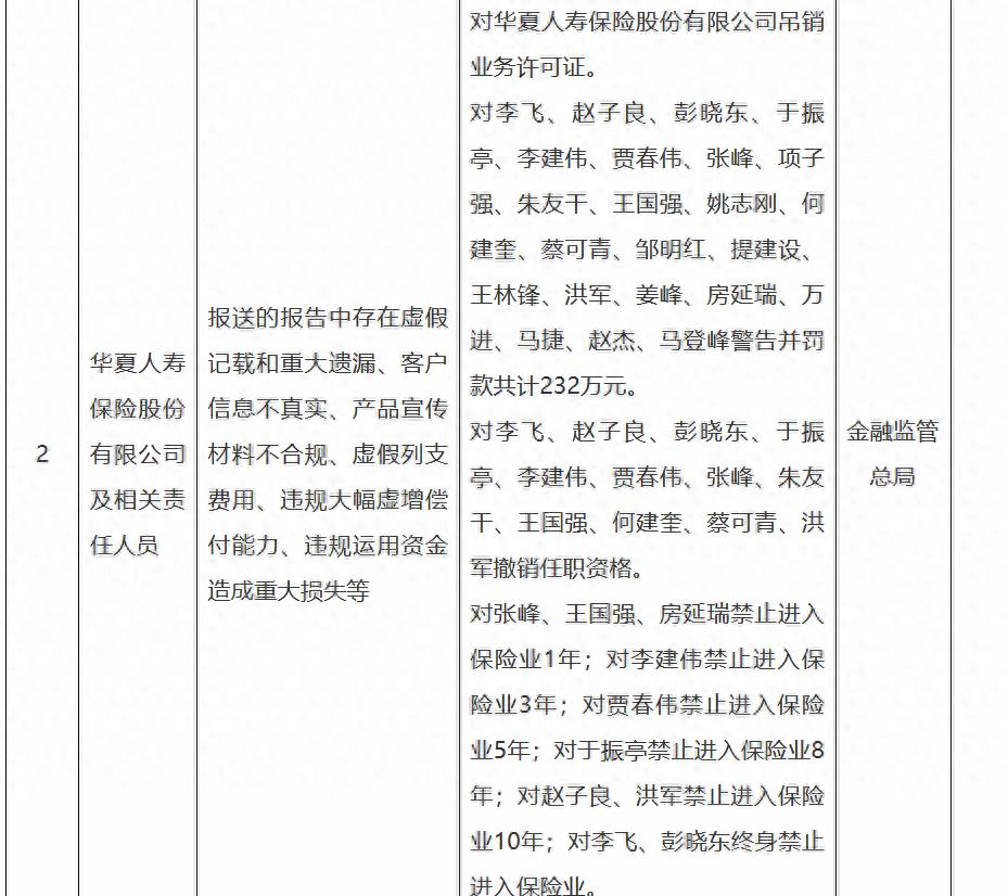 8月1日,国家金融监督管理总局行政处罚信息表显示,华夏人寿保险股份有限公司被吊销业务许可证,数十名相关责任人员受到了行政处罚。
