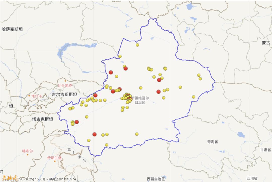 2025年以来(截至7月31日)新疆三级及以上地震活动分布图(四级以上红色标注)
