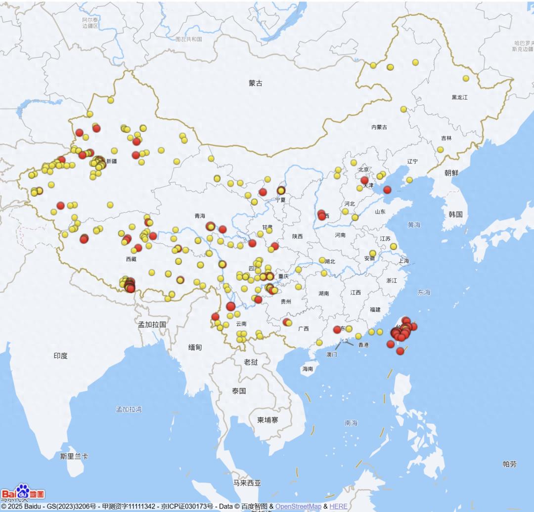 2025年以来(截至7月31日)全国三级及以上地震活动分布图(四级以上红色标注)