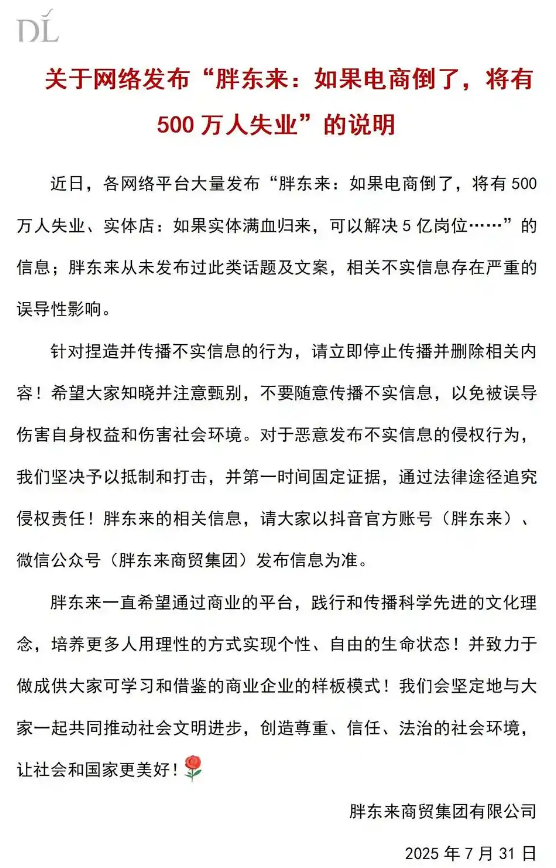 7月31日晚间,胖东来发布《关于网络发布“胖东来:如果电商倒了,将有500万人失业”的说明》。说明提到,近日各网络平台大量发布“胖东来:如果电商倒了,将有500万人失业、实体店:如果实体满血归来,可以解决5亿岗位……”的信息。胖东来从未发布过此类话题及文案,相关不实信息存在严重的误导性影响。