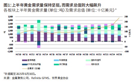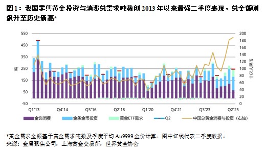 同日,世界黄金协会还发布了2025年二季度《中国黄金市场回顾与趋势分析》。分析显示,2025年二季度,中国市场零售黄金投资与消费需求达245吨,环比下滑10%,但同比增长28%,创下2013年以来二季度新高。上半年总需求达518吨,同比增长5%。按金额计,2025年二季度及上半年中国零售黄金投资与消费需求均创世界黄金协会有记录以来的最高水平。