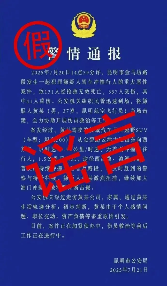 公安部网安局8月1日消息,“警情通报”是公安机关权威信息发布的重要载体,“蓝底白字”代表着官方信息的公信力。发布虚假“警情通报”,炮制恶性网络谣言,捏造耸人听闻的细节,误导公众认知,不仅消费了网民情绪,更损害了政府公信力,甚至引发公众恐慌,其行为严重扰乱社会秩序。