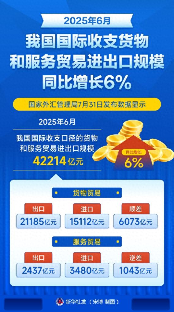 国家外汇管理局31日发布数据显示,2025年6月,我国国际收支口径的货物和服务贸易进出口规模42214亿元,同比增长6%。