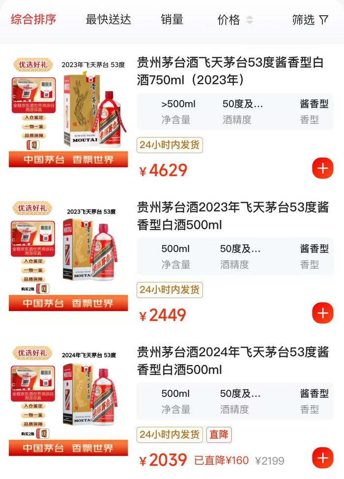 电商平台中多款飞天茅台产品在售/图片来源:京东
