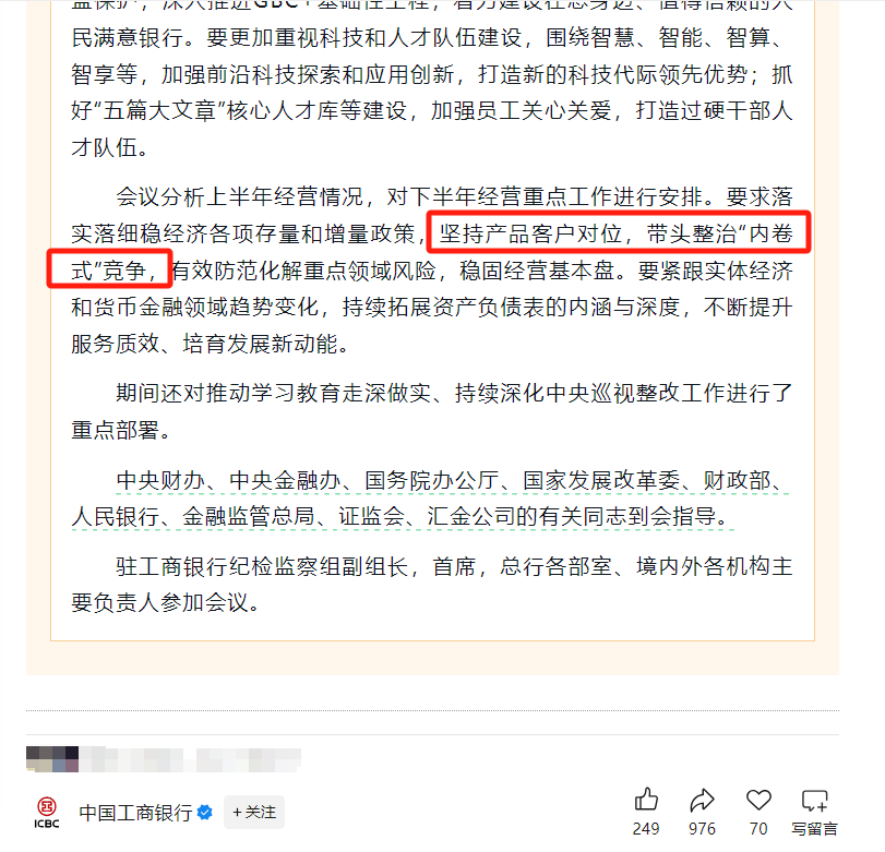 财联社记者注意到,在广东打响地方层面金融业反内卷第一枪后,工商银行也在大行层面率先表态。7月30日刚刚结束的年中工作会议上,工商银行明确要求带头整治“内卷式”竞争,成为首家将反内卷列入下半年工作重点的国有大行。