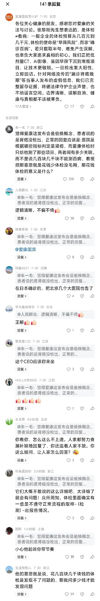 这些“爱康国宾美小护”们发的澄清帖在评论区就成了新的“靶子”,网民们很有兴致地在下面跟帖反驳,核心观点就是“说这么多,你的意思就是几百块钱做的体检没用呗!”双方基本上陷入各执一词的“无效沟通”困境之中。