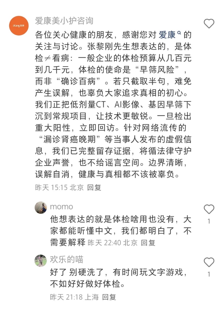 各位关心健康的朋友,感谢您对爱康的关注与讨论。张黎刚先生想表达的,是体检≠看病:一般企业的体检预算从几百元到几千元,体检的使命是“早筛风险”,而非“确诊百病”。若只截取半句,难免产生误解,也辜负大家追求真相的初心。我们正把低剂量CT、AI影像、基因早筛下沉到常规项目,让技术更敏锐。一旦检出重大阳性,立即回访。针对网络流传的“漏诊肾癌晚期”等当事人发布的虚假信息,我们已完整留存证据,将循法律守护企业声誉,也不给谣言空间。边界清晰,误解自消,健康与真相都不该被辜负。