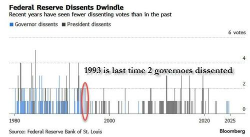 如下图所示,上一次有多名美联储理事在一场会议上同时投下反对票已经要追溯到1993年了——自那以来,美联储总共举行了259场政策会议。在此期间,虽然美联储也曾出现过单次会议上同时出现两三张反对票的情况,但投下反对票的多数是地区联储主席(在影响力方面要略显理事一筹)。