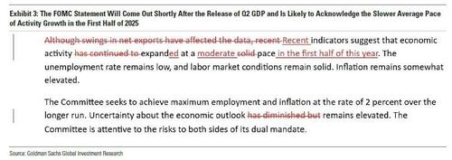 下图是摩根士丹利预期的本月美联储声明变动。其中,删除线表示将删除的6月声明内容,加粗文本则表示大摩预计将在7月份声明中添加的新内容。