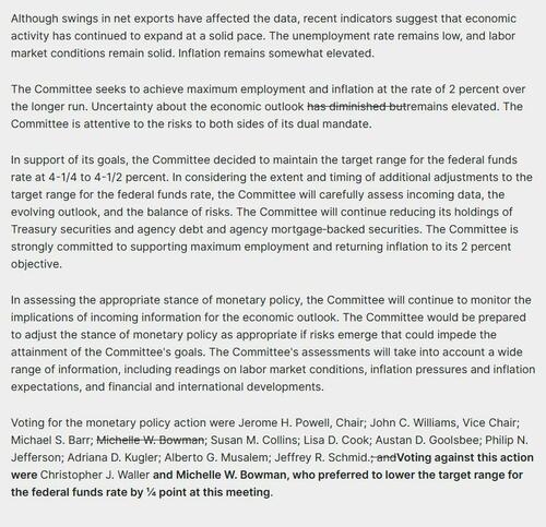 目前,许多分析师预计,美联储理事沃勒和负责金融监管的副主席鲍曼可能会在本次会议上投下反对票,这两位特朗普任命的美联储官员近期都曾对美联储迟迟不降息表露过担忧——认为鉴于就业风险上升,当前的利率过高。