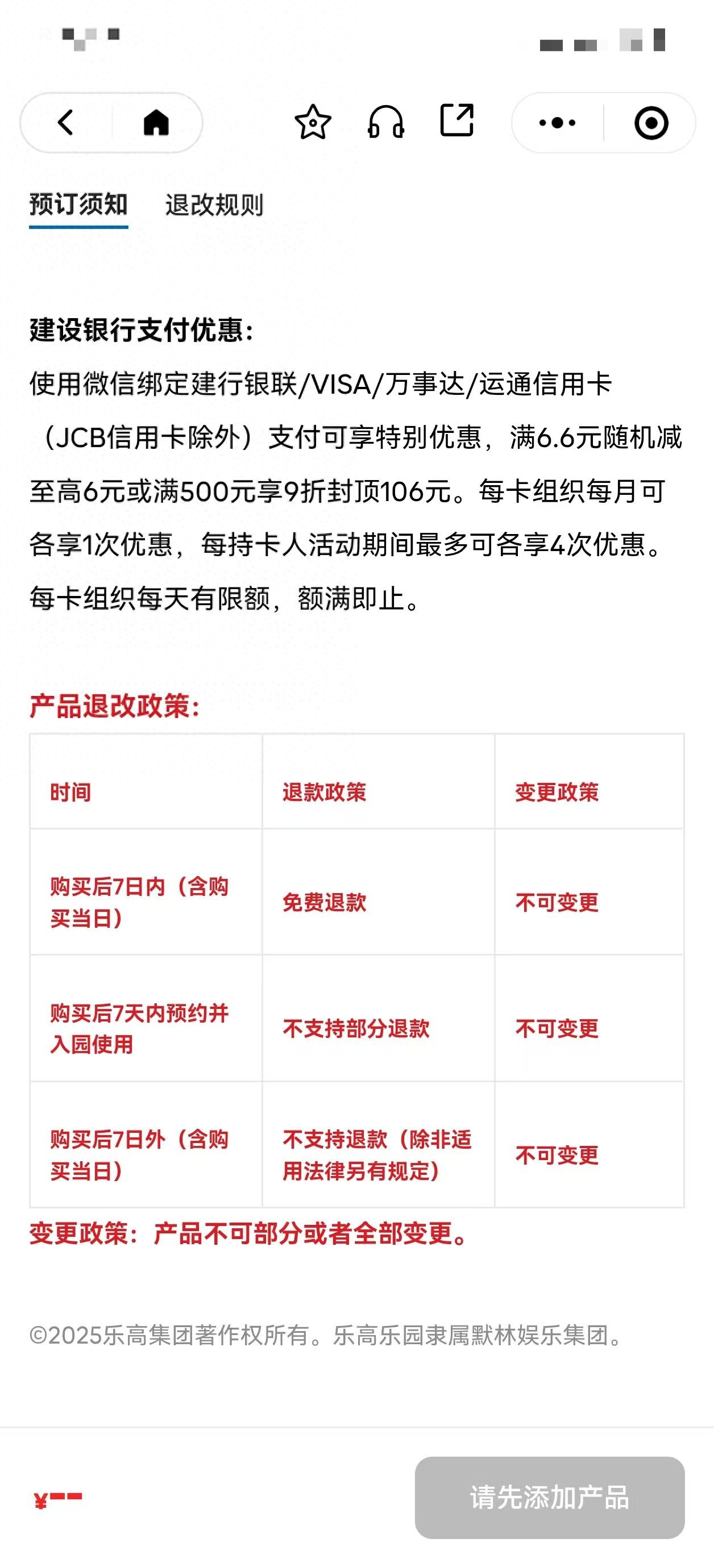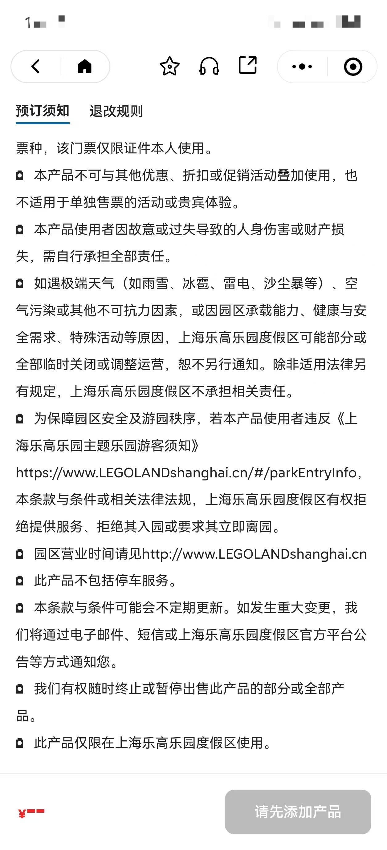 在上海乐高乐园的门票及酒店预订须知里,均有“如遇极端天气(如雨雪、冰雹、雷电、沙尘暴等)、空气污染或其他不可抗力因素,或因园区承载能力、健康与安全需求、特殊活动等原因,上海乐高乐园度假区可能部分或全部临时关闭或调整运营,恕不另行通知。除非适用法律另有规定,上海乐高乐园度假区不承担相关责任”的表述。