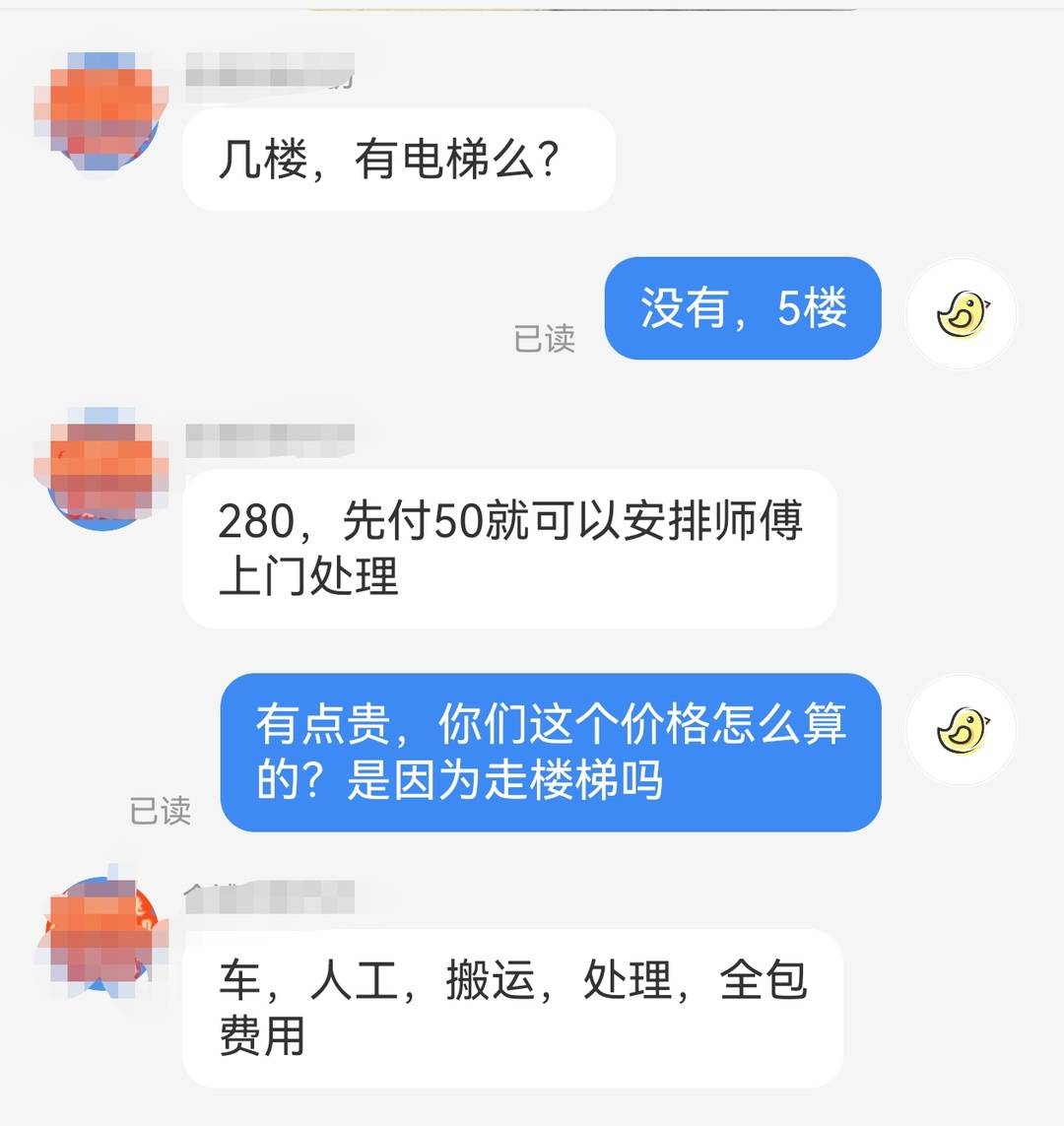 一家代扔公司表示,费用包括车、人工、搬运、后续处理等