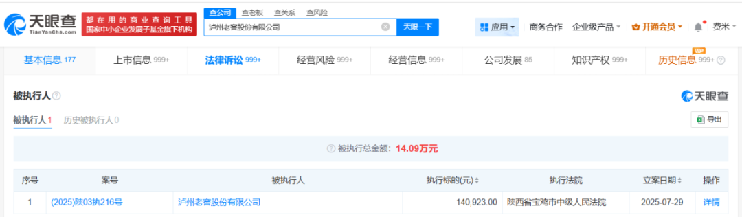 7月29日,泸州老窖(000568)新增一则被执行人信息,执行标的14万余元,执行法院为陕西省宝鸡市中级人民法院。
