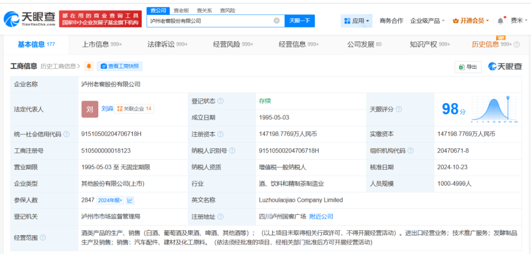 泸州老窖股份有限公司成立于1995年5月,法定代表人为刘淼,注册资本约14.7亿人民币,经营范围包括酒类产品的生产、销售,进出口经营业务,技术推广服务等,由泸州老窖集团有限责任公司、泸州市兴泸投资集团有限公司、香港中央结算有限公司等共同持股。