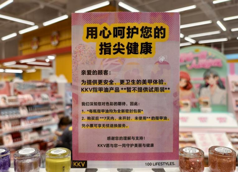 7月28日,KKV方面回应极目新闻记者,公司对试用装有严格的管理制度,但也不能强制顾客的个人行为,“为此我们对试用装使用管理进行升级,其中包括但不限于暂停指甲油试用装、取消口腔喷雾等产品试用装,更多升级举措请留意门店更新。”