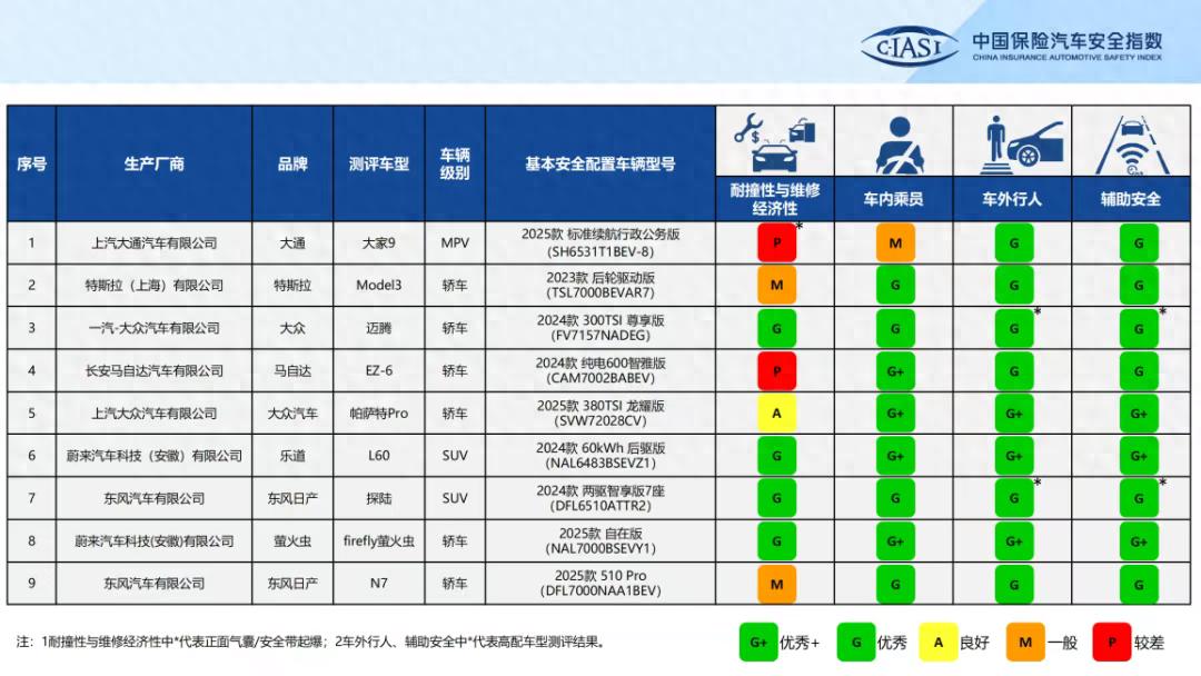 本次“C-IASI”结果发布共涉及9款车型,包括“大通大家9、特斯拉Model 3、大众迈腾、马自达EZ-6、大众帕萨特Pro、乐道L60、东风日产探陆、firefly萤火虫、东风日产N7”。在此前的两次测评结果中,已经有13款车型涉及测试。