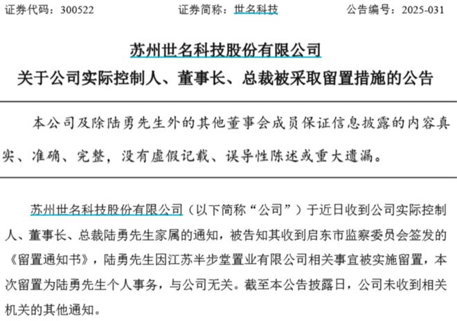此次,世名科技少见的披露了老板被留置的原因:陆勇是因为江苏半步堂置业有限公司相关事宜被实施留置。