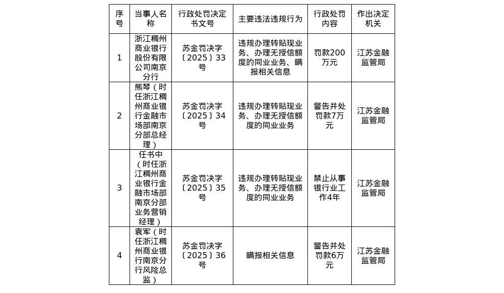 国家金融监督管理总局江苏监管局发布了4张罚单,涉及浙江稠州商业银行股份有限公司南京分行及其相关责任人。
