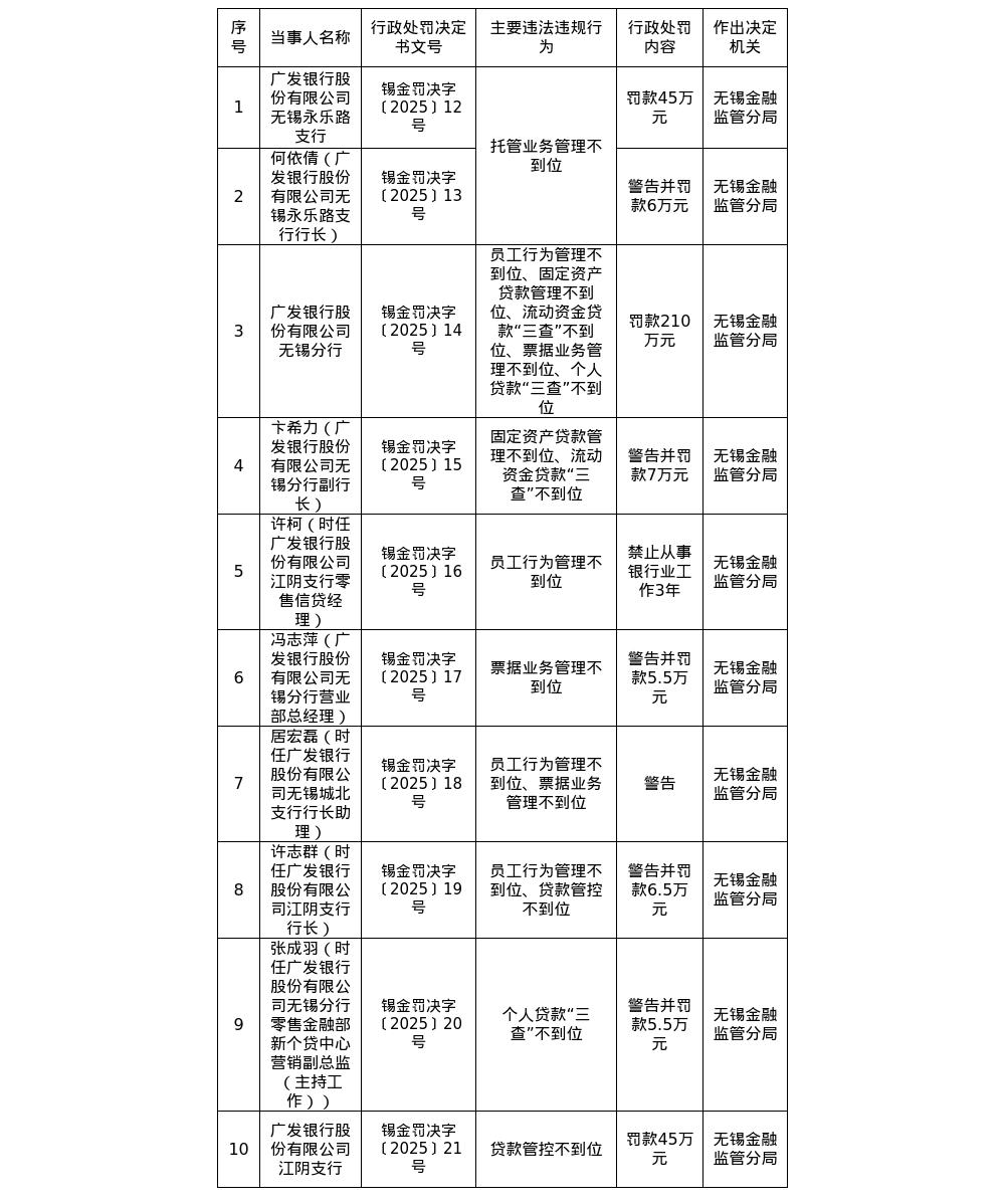 国家金融监督管理总局无锡监管分局对广发银行股份有限公司无锡分行罚款210万元;对卞希力警告并罚款7万元;对冯志萍警告并罚款5.5万元;对张成羽警告并罚款5.5万元。