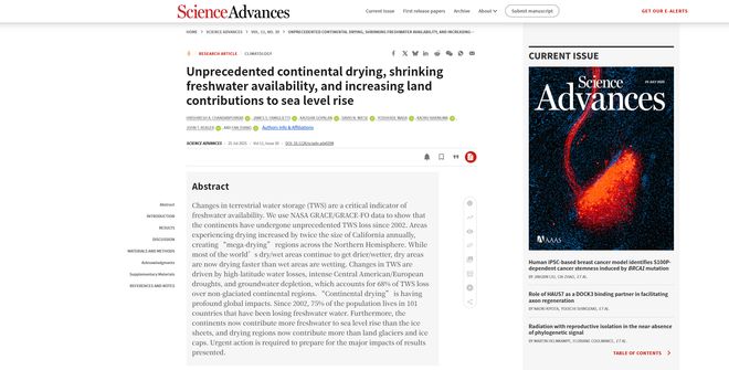 据研究,水量流失规模巨大,已成为导致海平面上升的一个主要因素。研究人员发现,自2015年以来,各大洲的水资源流失对海平面上升的贡献超过了南极或格陵兰冰盖的融水,每年使海平面上升近1毫米。