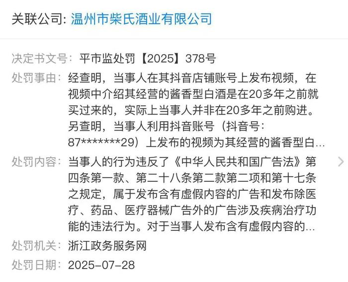 天眼查经营风险信息显示,7月28日,温州市柴氏酒业有限公司因发布含有虚假内容的广告等行为,被平阳县市场监督管理局合计罚款6000元。