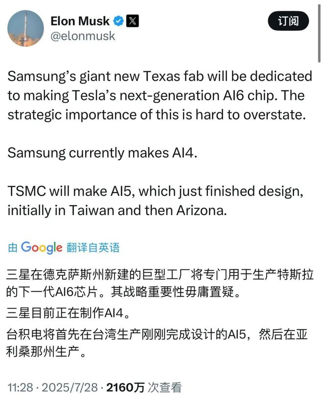 当地时间7月28日,特斯拉CEO埃隆·马斯克在X社交平台发布一则重要消息:三星电子将在其位于美国得克萨斯州的新工厂生产用于特斯拉自动驾驶汽车的下一代AI芯片。