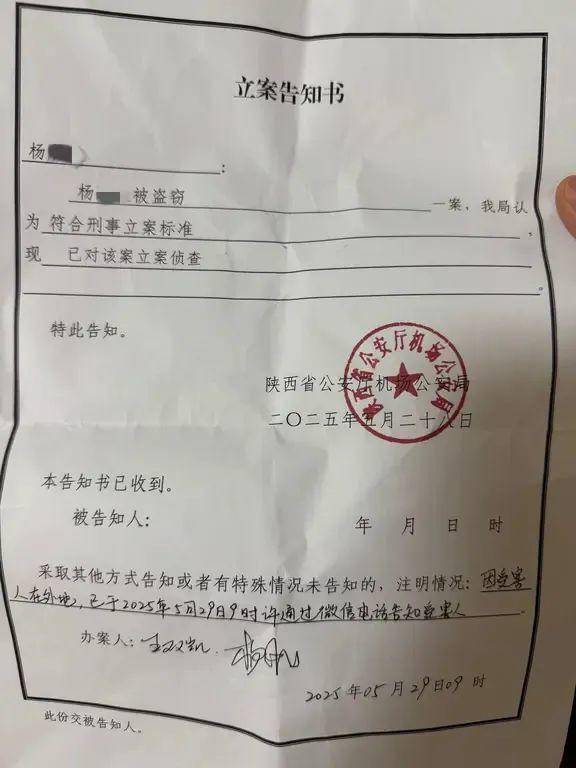 陕西省公安厅机场公安局出具的立案告知书显示,杨女士报称的盗窃案,我局认为符合刑事立案标准,已决定立案侦查。