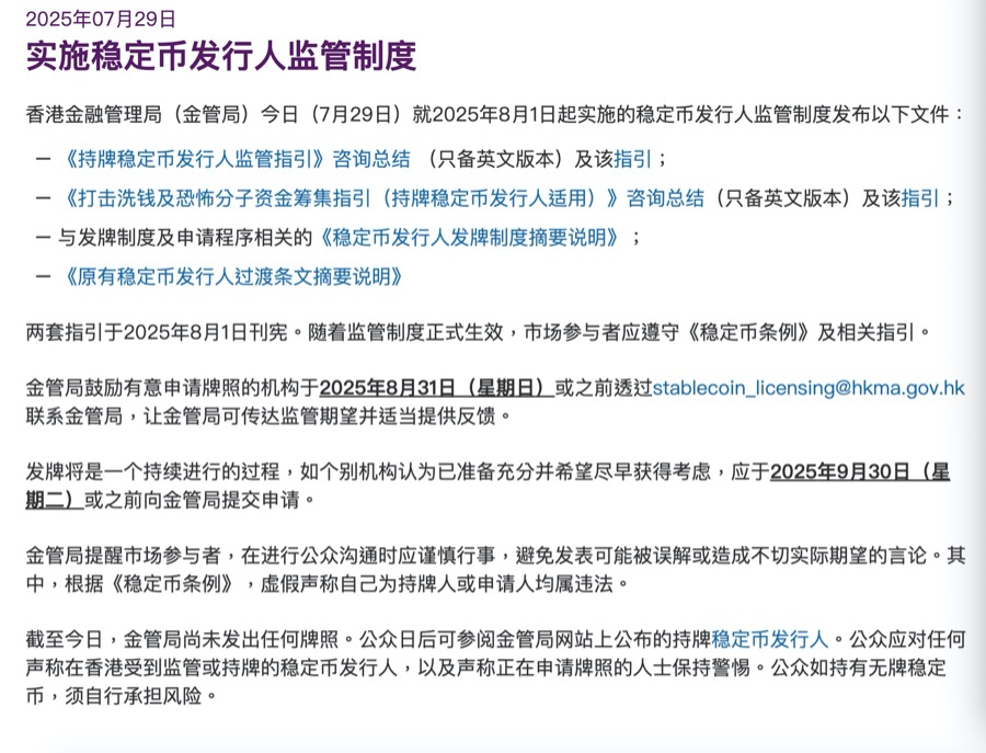 7月29日,香港金管局就2025年8月1日起实施的稳定币发行人监管制度发布一系列文件。