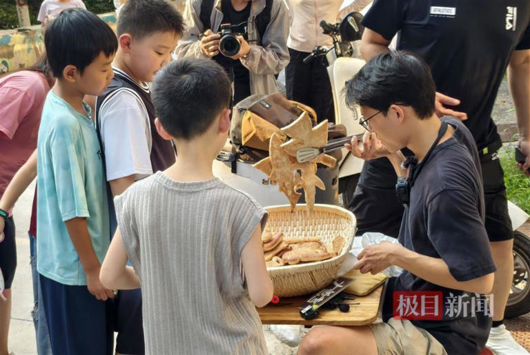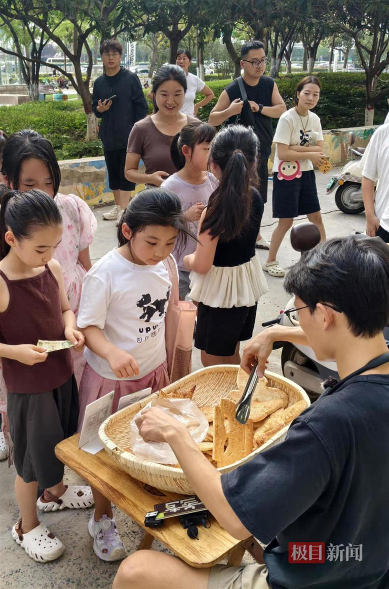 小杨告诉极目新闻记者,最先开始他的烧饼卖过五块钱、三块钱,最后考虑到小朋友的零花钱有限,就降到了一块钱,卖一块钱不赚也不赔,他暂时不会涨价。一开始他���是做着玩,也有很多烤煳了烤断了的失败的作品,后来看着大家这么喜欢也就坚持做了下来。为了满足小朋友的喜好,他的烧饼都是甜口的。小杨说,做烧饼的时候还是很热很累的,但小朋友喜欢就是他最开心的时候。最后,小杨呼吁大家,因为天气太热,排队的人很多,离他太远的小朋友先不要来,目前他将继续做下去。